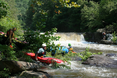 We soon made it to the prize on this classic creek....Stateline Falls. All got out to scout, a few decided to walk and the rest fired it up with varying results. After scouting the rapid & watching another group run it, I was ready to get back in my boat and head to the eddy at the lip of the drop.